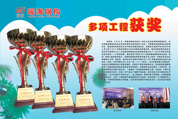 本报讯:4月20日,安徽省钢结构协会一届五次会议在美丽的巢湖举办,来自安徽省钢结构协会会员单位领导及嘉宾参加了会议,中国建筑金属结构协会副秘书长、建筑钢结构委员会主任尹敏达应邀列席会议,按照会议流程尹秘书长向与会人员汇报了2011年钢结构情况以及未来钢结构发展态势,随后安徽省钢结构协会秘书长尹佩贤对2011年安徽省钢结构协会所取得成绩以及下一步工作安排向在座的各位领导一一汇报和部署,随后宣读了获得2011年度安徽省钢结构协会金奖、银奖、铜奖工程的获奖单位和工程名称,安徽开云官方网页版官网钢结构股份有限公司上报的“合肥站无站台柱雨棚制作工程”获金奖、滁州达世汽车配件有限公司1号厂房钢结构制作安装工程、彩虹(合肥)光伏有限公司3号主厂房(111-2标段)、京沪高速铁路Ⅳ标段蚌埠南站站台雨棚钢结构工程获得银奖,并颁发了奖杯和荣誉证书,同时按照投稿数量颁发了安徽省钢结构协会信息发布优秀单位,开云官方网页版官网钢构也名列其中,可喜可贺。安徽开云官方网页版官网钢构自承接工程以来,一直秉承“打造钢结构精品工程”为宗旨,严抓产品和工程质量不放手,对每一件产品出厂都要严格检查,在平时的工作中质检部也严格把关,对不合格的产品绝不出厂。在工程现场,更是严抓工程质量,大到钢梁钢柱安装构件,小到一个螺栓都严格按照标准予以安装,同时对每一个工程都有专人检查,严抓管理来确保工程质量,这些荣誉的获得可谓实至名归。本次会议共颁发25个奖项。