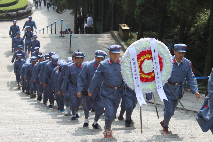 接下来,我们来到烈士陵园祭英雄——井冈山革命烈士陵园,这里是一座山,郁郁葱葱。陵园以阶梯修筑,走进园门,便是109级台阶,高耸而凝重,我们急促的心情随之放慢。来到革命烈士灵堂,我们怀着一颗虔诚的心,献上了花圈并深深地鞠了躬,同时默哀3分钟,缅怀那些在井冈山斗争中牺牲的革命先烈和那些未能留下名字便匆匆离开这个世界的无名英雄,缅怀他们在艰难困苦的革命年代,为了缔造“共和国第一块奠基石”而献身的精神。英烈堂前上书的“井冈山根据地革命先烈永垂不朽”十四个醒目的大字,更让人顿生浩然正气凛然涌动、阳刚之力震慑灵肉之感。置身其中,一种心眼湿润的感觉油然在心底升起。井冈山的松柏为什么四季常青?一定是先烈的身躯所化成!井冈山的杜鹃花为什么这样红,一定是先烈的鲜血所染红!党魂浩然,英魂长存,死难烈士犹如火中的凤凰,得到永生。