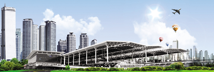 京沪高速铁路蚌埠南站雨棚总长421米,宽121.15米,沿雨棚纵向共有26条轴线,横向有4条轴线,钢结构覆盖面积51176.5㎡,雨棚全长范围 内设置2道伸缩缝,位于P7、P19轴。雨棚为钢管桁架体系,桁架上弦中心线高度16.7米。平行于股道方向柱距为18米,天桥处为21米,垂直股道方向柱跨分别为41.65米,33.50米和43.00米。