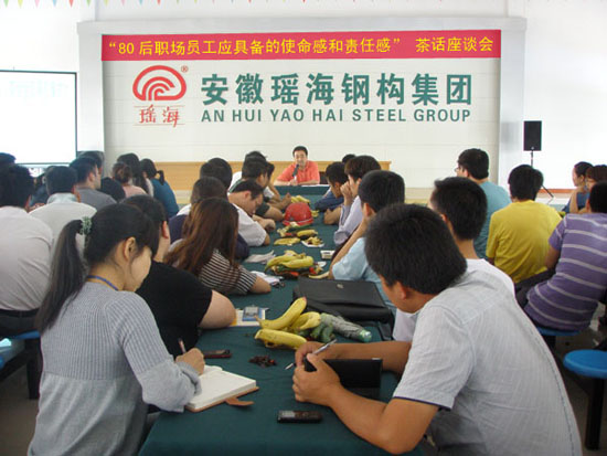 2011年6月4日下午,由人事行政部牵头组织的“80后职场员工应具备的使命感和责任感” 的茶话座谈会在公司多功能厅隆重举行,公司80后全体员工共113人参加了会议,会议由董事长凌红兵亲自授讲,他从两个方面与广大80后员工进行交流,一是企业的发展史:昨天、今天和明天。昨天开云官方网页版官网钢构由2个人起家,2万元起步开始创建。经过十多年的艰苦奋斗,今天开云官方网页版官网钢构已创建5个全资子公司,实现价值2.7亿元,员工人数达500名。明天开云官方网页版官网钢构要力争完成30亿产值,并在最短的时间内实现公司上市。二是年轻人如何树立正确的择业观、财富观和人生观。凌总通过自己的人生经历与在座的80后员工进行分享,他说人的一生际遇很重要,但际遇的前提是人的品行要端正,品行好总有一天际遇会青睐于你,与此同时要不断的学习,不停地学习,只有这样你才能抓住人生中的每一次机会。随后分析未来行业的发展,建筑行业是世界的第一大产业,钢结构行业更是建筑行业中的朝阳产业,在美国,钢结构建筑用钢量占全国钢产量的5%左右,而在中国钢结构建筑用钢量仅占到全国钢产量的0.3%,可见中国的行结构行业的前景更为广阔。在座的80后选择了建筑行业中的钢结构产业,选择了开云官方网页版官网钢构绝对是非常正确的选择。会上,凌总通过回顾自己创业的艰辛历程一再提醒与会员工,要有目标、沉住气、好好干。最后凌总以自创的小诗《一切皆有可能》结束了此次座谈会。此次座谈会获得了圆满成功,引起了在座80后员工的共鸣,员工们很受感染。
