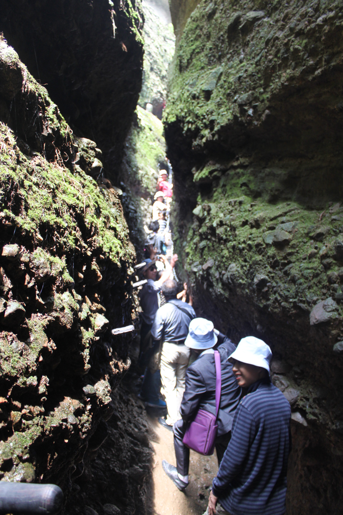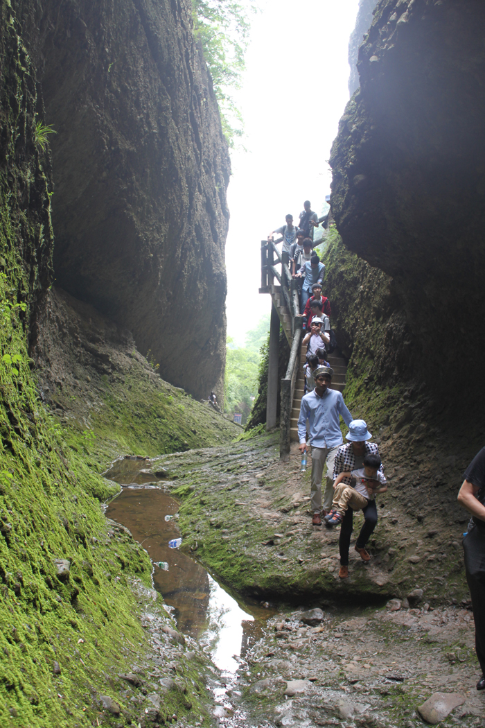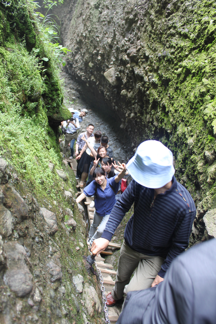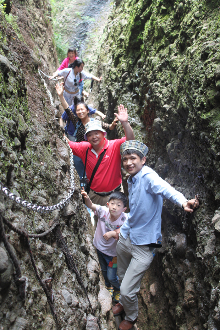 两边岩石峻峭,想来只有飞鸟可上了。如何前行?导游为我们作着示范和先锋,并一再叮嘱我们注意脚下安全。手脚并用,也觉得笨拙艰难,两边的绳索和岩壁上的钢钉成了我们借以依赖的工具,不时就汗流浃背了。极好的是一路有清幽的山泉潺潺流下,水的清凉让人觉得很是沁入心脾的清凉,还可以小憩清洗,就是口渴也是可以手捧小饮。