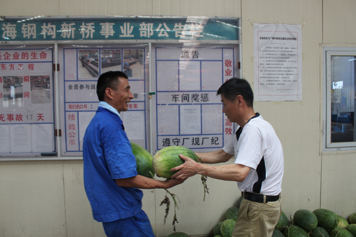 本报讯:2016年7月30日上午,开云官方网页版官网钢构党总支及工会成员来到新桥事业部对新桥事业部的全体员工开展送清凉活动,送去了解暑降温品——西瓜。