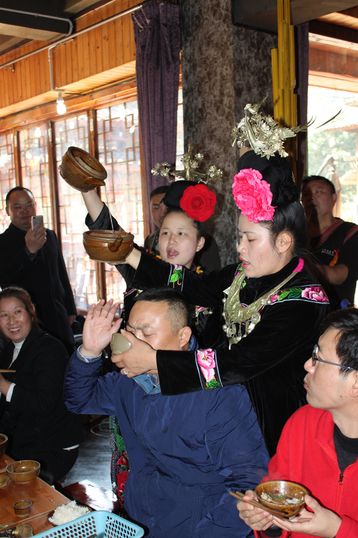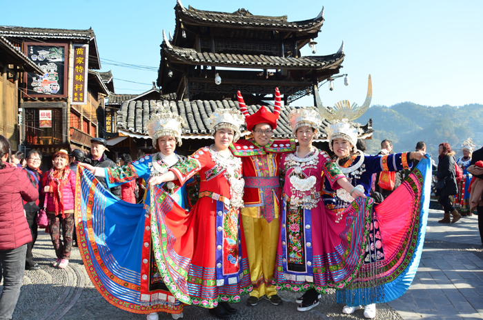 翌日,我们来到西江千户苗寨,感受了苗族的生活,体验到苗族的风情。西江千户苗寨是一个保存苗族"原始生态"文化完整的地方,由十余个依山而建的自然村寨相连成片,是目前中国乃至全世界最大的苗族聚居村寨。我们首先来到民族风情街,看看当地的特色和特产,并选购着代表民族产品的纪念品,品尝着当地的小吃。中午时分观看了苗族歌舞表演,华丽的服饰,欢快的歌舞和这美丽的爱情故事都能使你更加了解苗族人民! 苗族古歌演唱,演唱者全是寨中的老人,用苗族古语演唱其史诗般宏大的古歌。随后体现了苗族的另一个文化——长桌宴,只见长约10米的长桌一字排开,我们兵分2边就座,品尝着独具特色的酸鱼汤,聆听着苗寨的祝酒歌,无不美哉乐哉。