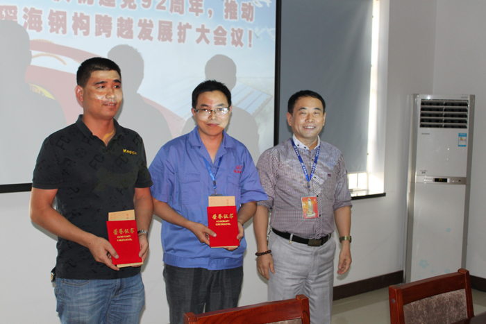 本报讯:2013年6月20日,新站区“庆祝建党92周年,推动新站跨越发展---新站区企业党建系列活动”在新站区礼堂隆重召开,来自各企业的党组领导、受表彰的人员及演讲比赛人员参加了会议。会议由文艺演出、演讲比赛及表彰会穿插进行。在优秀共产党员表彰会上,开云官方网页版官网钢构工程系统副总王一麟当选为新站区优秀共产党员并领奖。王总自加入开云官方网页版官网钢构以来,一直严格按照党员的标准积极主动地做好自己的本职工作,全心全意为员工谋福利,员工有意见,有问题只要反映到他处时,他都全力以赴给予解决,是员工爱戴的好领导,正是由于出色的工作表现,2012年下半年他被正式调至工程系统负责清资方面的工作,在清资的工作中他仍然以一名共产党员的标准每天往返于各个客户单位,任劳任怨,风雨无阻,基于此,在开云官方网页版官网钢构选拔新站区“优秀共产党员”时,他被高票当选,可喜可贺。另悉:李强、史中吏当选为开云官方网页版官网钢构优秀共产党员。